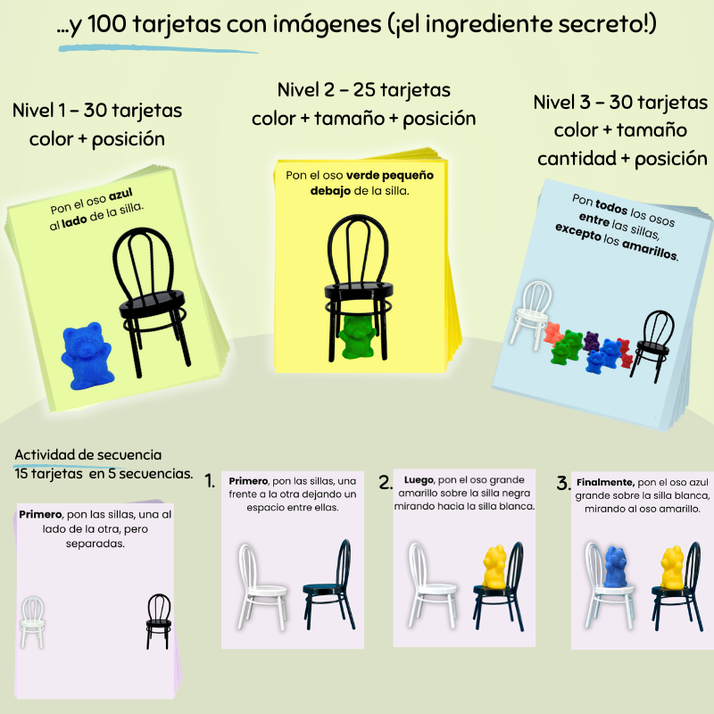 85 picture cards are organized into 3 levels of increasing difficulty. It is the cards that will guide your practice and scaffold the language so that you can meet children where they’re at and grow from there!