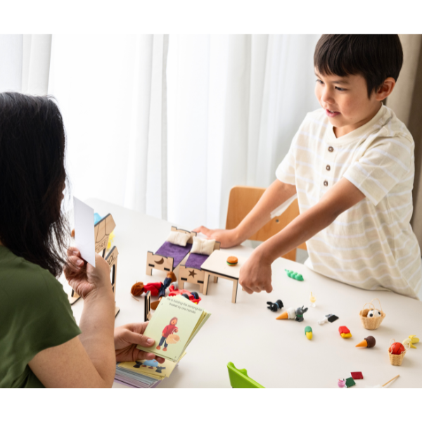The child picks up a card and describes the image using the language you just modelled to them when you were the speaker. Arrange the objects as they described and say"ready!" They reveal the picture card and compare it to the arrangement. If it matches, yay! If not, this is your teaching moment.