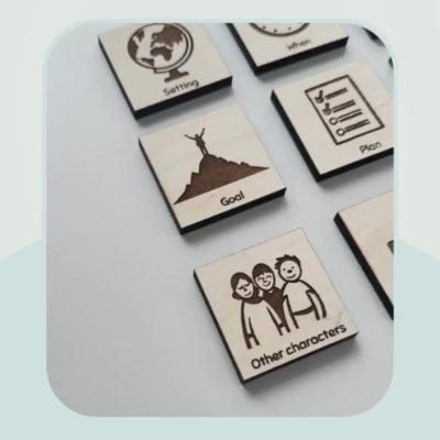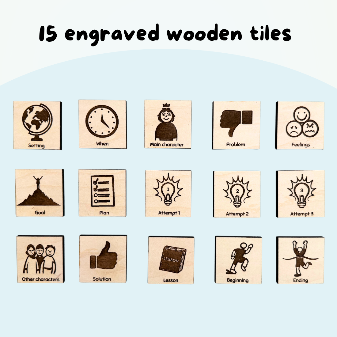 These tiles highlight the key elements of story grammar — the framework that helps children understand how stories are built. Story grammar gives children a way to organize their thinking about what's happening in a story and recognize essential parts such as the characters, setting, problem, actions, and solution.
