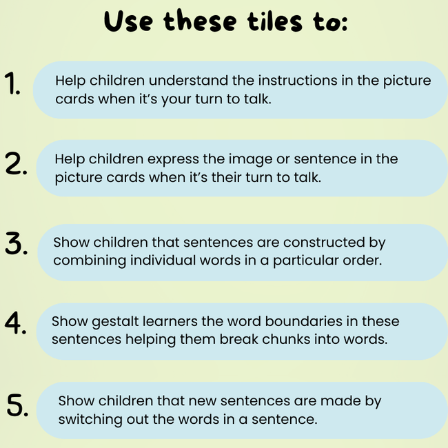 These tiles are especially helpful for gestalt learners, as it makes word boundaries clear and shows how spontaneous language can be created simply by changing the vocabulary within a sentence form.